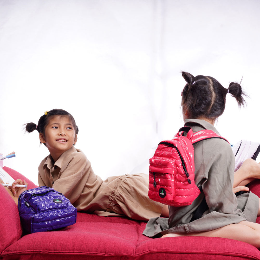 Small kids size version of our classic PUFFER bag, SUPERMINI is a quilted extra small backpack. Made of "metal" coated nylon, it has a small front pocket and an inner one, both zippered. Available in a selection of glossy colours.